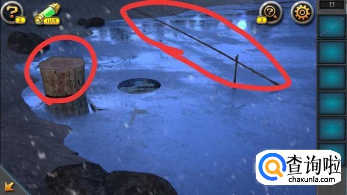 到悬崖下方后,来到水池旁边,捡起木桩和钓鱼竿。