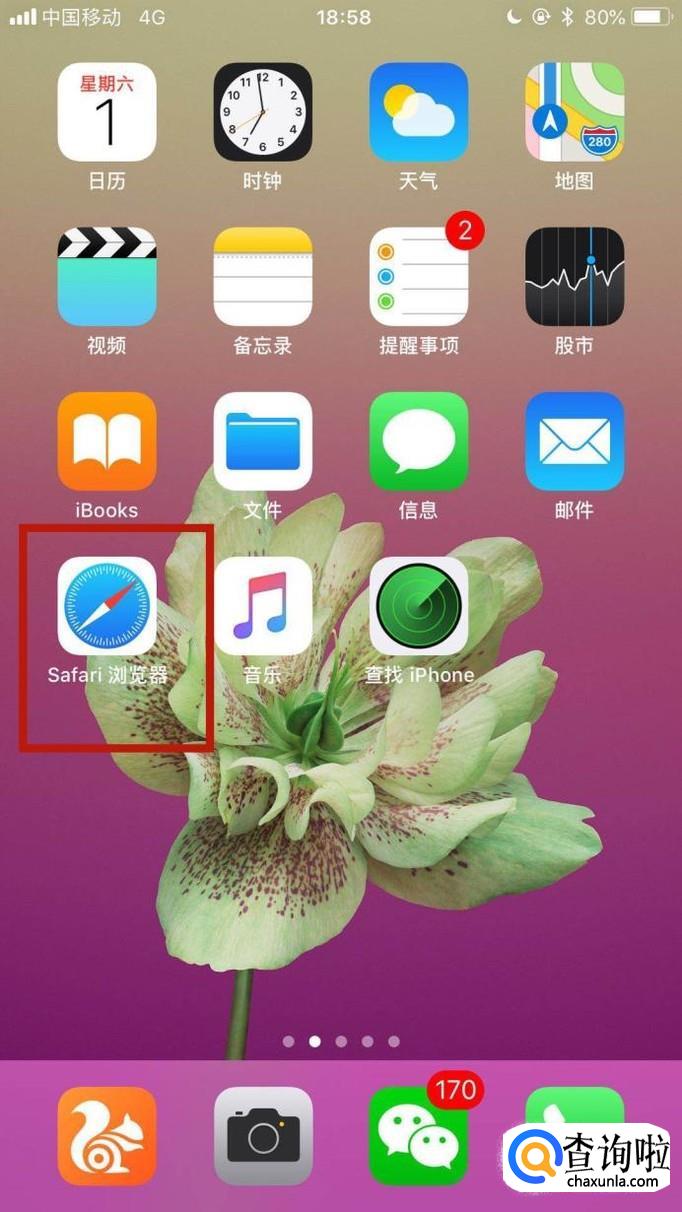 在我们的手机桌面上找到Safari浏览器并点击它,如下图所示。
