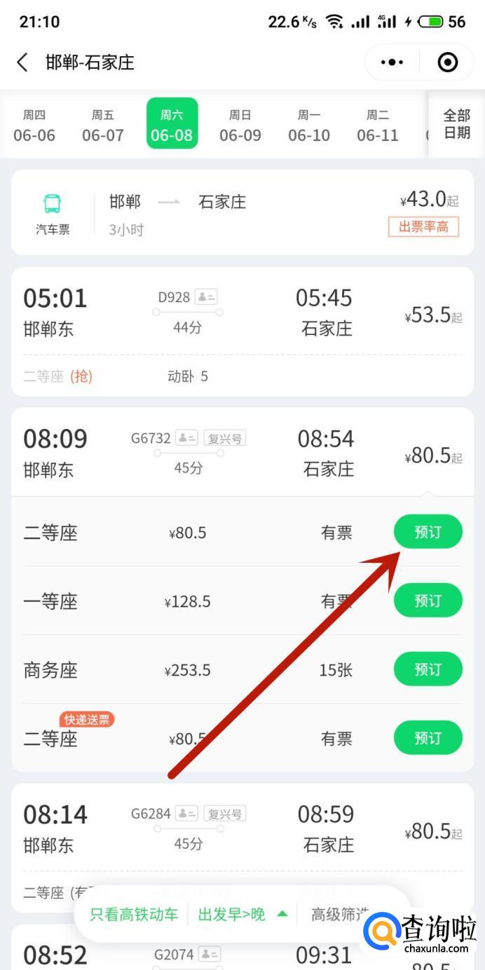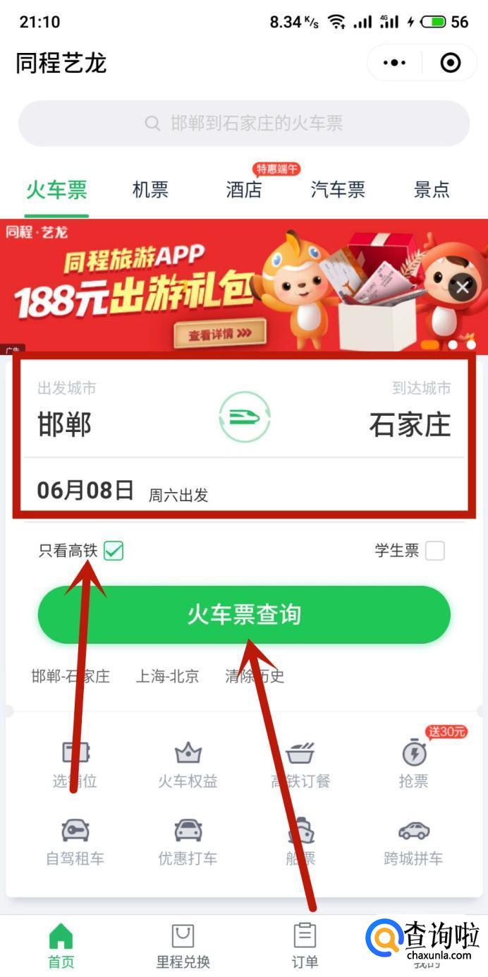 进入之后,选择乘车区间、乘车时间,勾选“只看高铁”,点击“火车票查询”,如图所示。