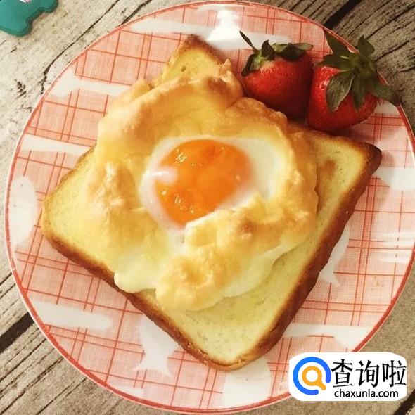 把蛋白放在吐司片上,蛋白中间挖坑,放入完整的蛋黄,放入烤箱,140度烤15分钟即可。