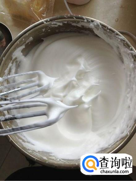 蛋白放入打蛋碗中,加适量的白糖,打发成硬性发泡的状态备用。