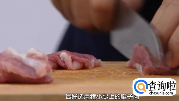 猪肉切成片,最好选用猪小腿上的腱子肉。