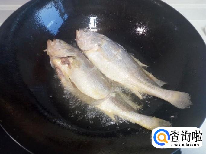 锅内放入油加热,油热后放入黄花鱼,小火煎塌。煎塌至表面焦黄,盛出备用。