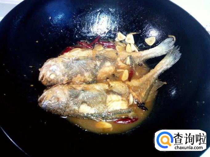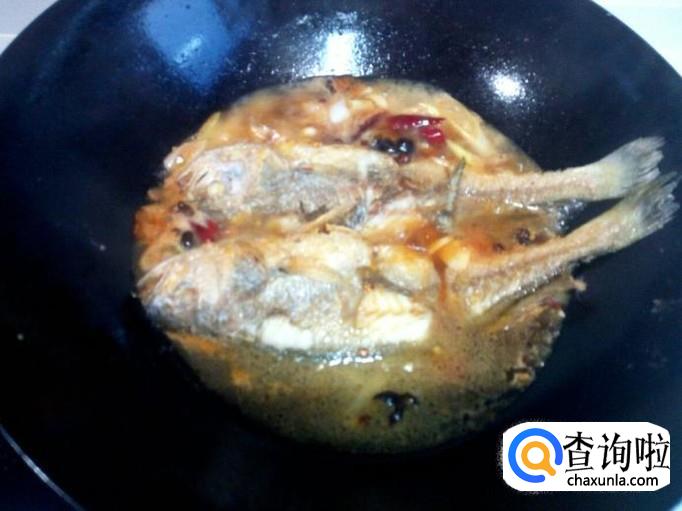 料汁烧开后,放入煎塌好的黄花鱼,再放入水,水和鱼一平即可。大火烧开,转小火慢炖。