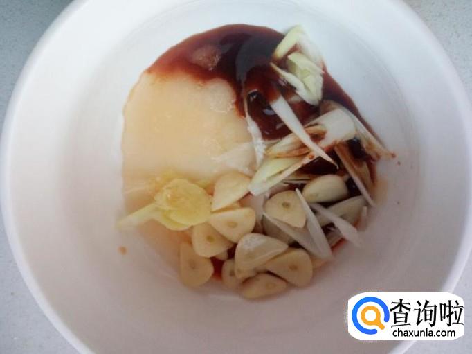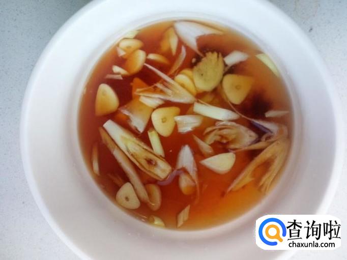 把切好的葱,姜,蒜,放入碗里。放入盐,料酒,白糖,醋,少许耗油,少许酱油,兑水,调和成料汁。