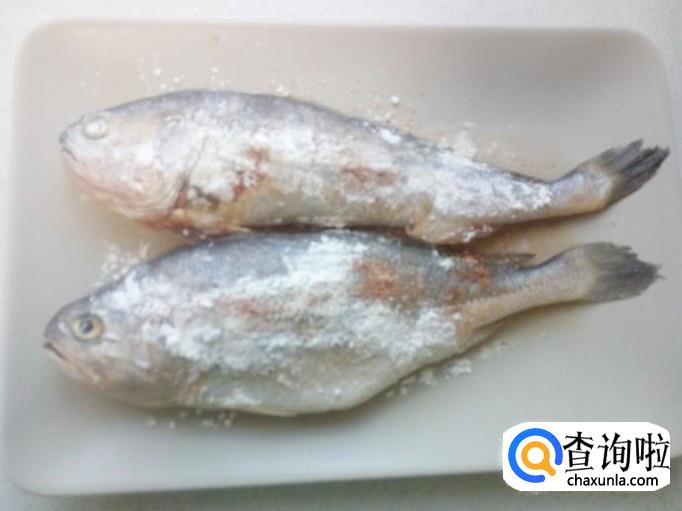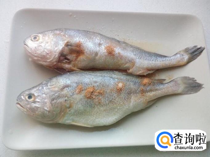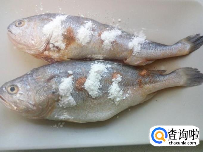 黄花鱼收拾清洗干净,控干水分。在鱼身上划刀,然后放入料酒,少许盐,五香粉,腌制十分钟。