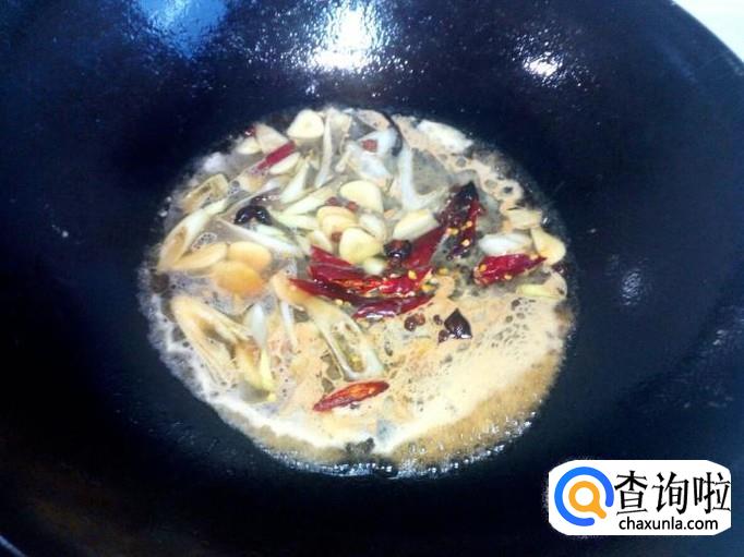 锅里盛出煎塌鱼多余的油,留少许油在锅中加热,油热后放入花椒,八角爆锅。然后把调和好的料汁倒入锅中,放入红干椒,烧开。