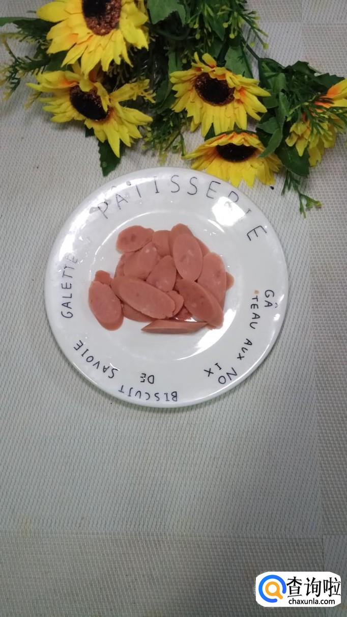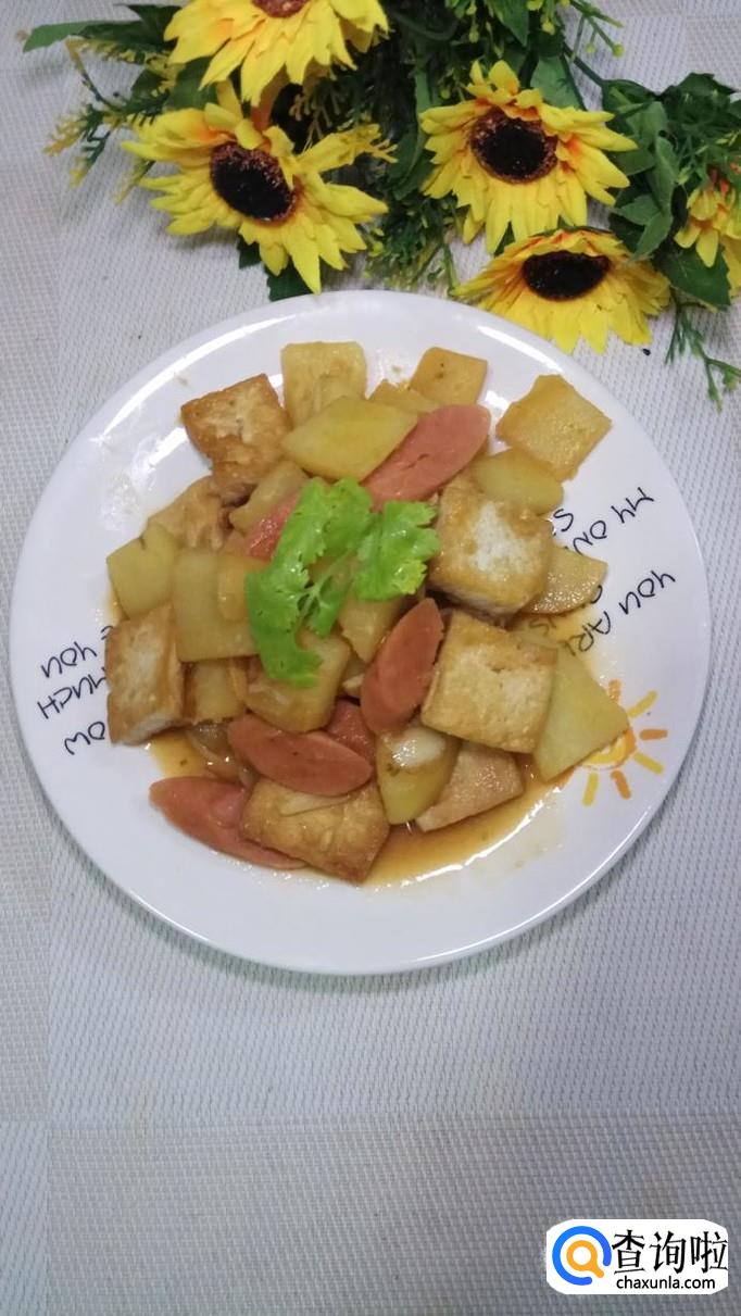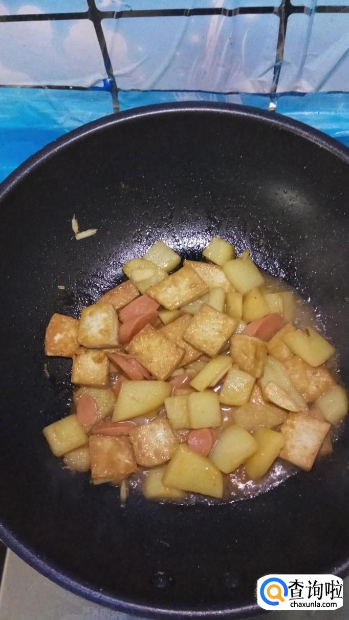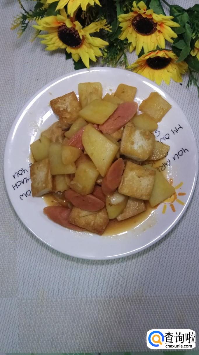 将土豆去皮后,切成小块,用清水洗去淀粉;将老豆腐切成方块;再将火腿肠去除外衣,切成小块,放入盘中备用。