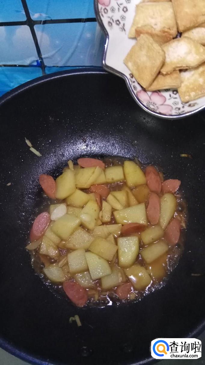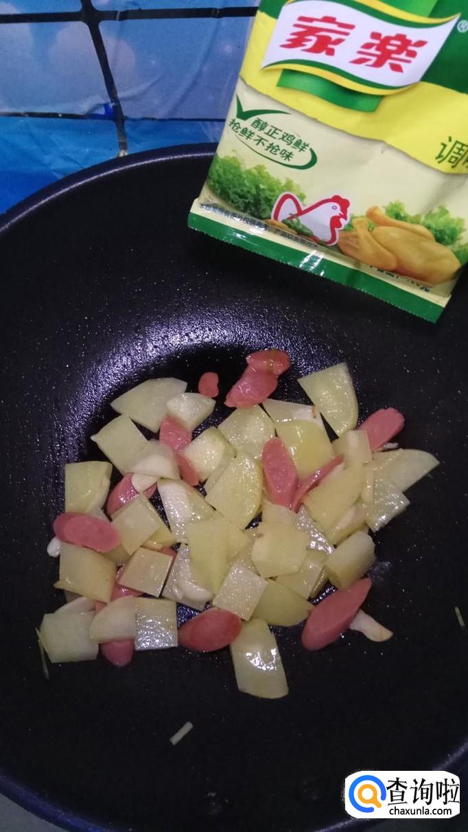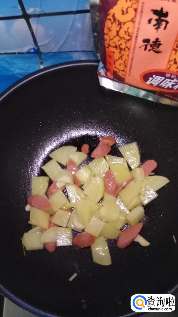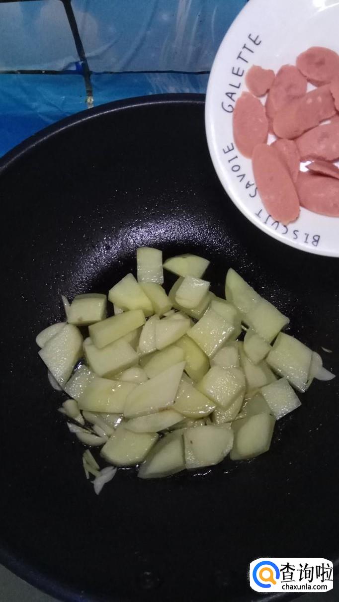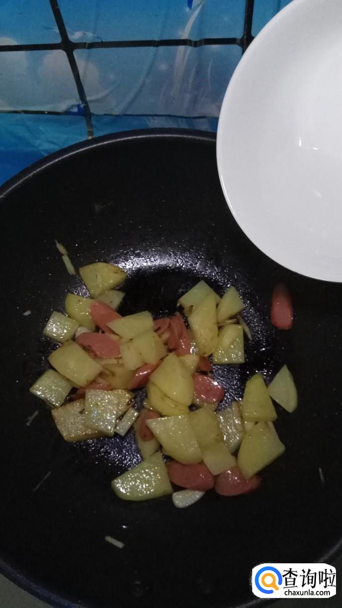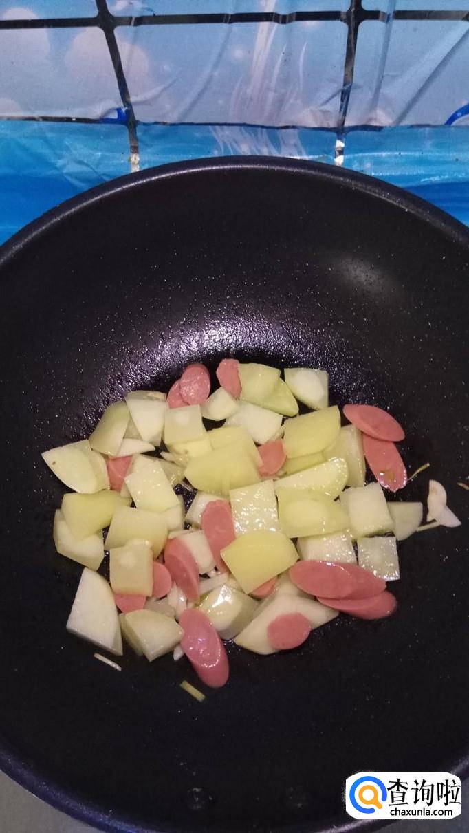 将香肠放入锅中,和土豆一起翻炒均匀。