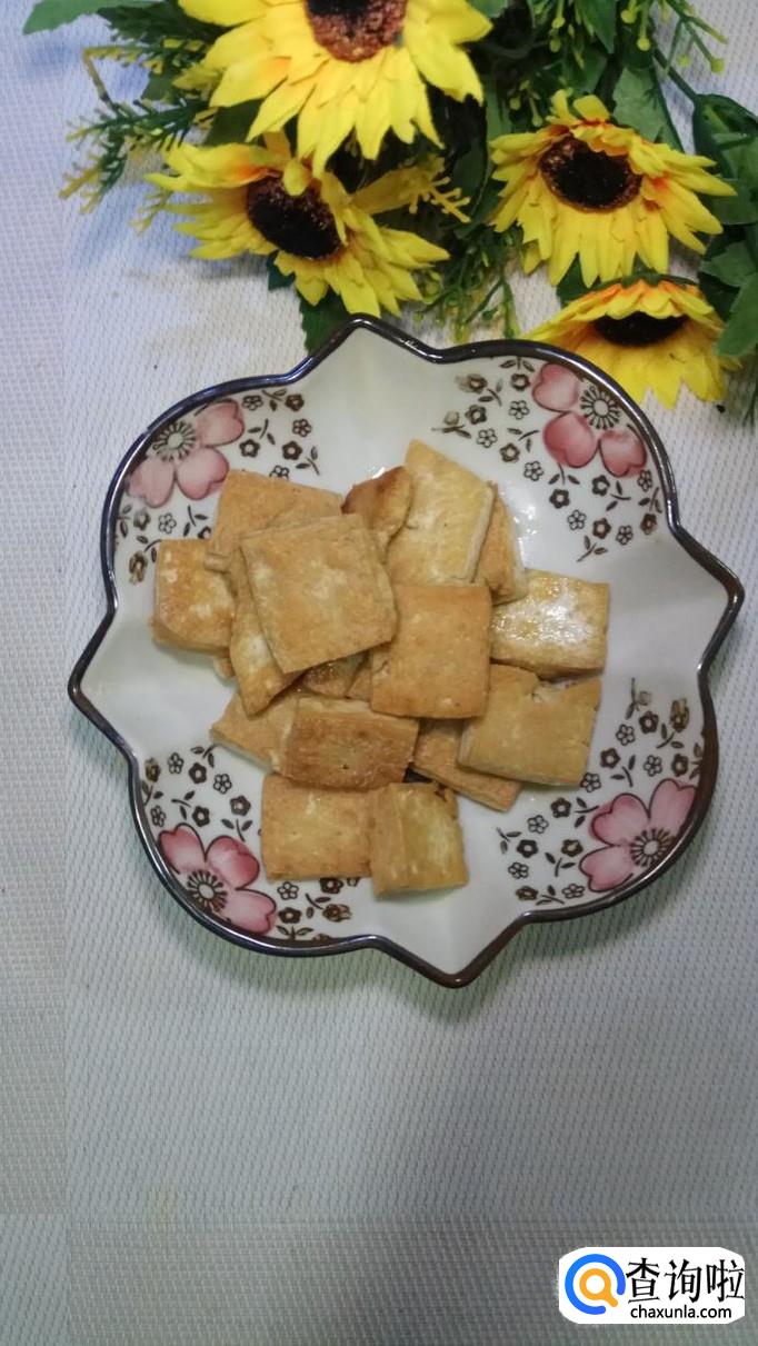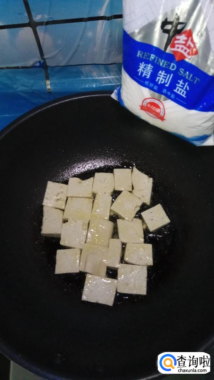 可以加适量的食盐,这样会让老豆腐更加入味,煎至老豆腐两面金黄后,盛出备用。