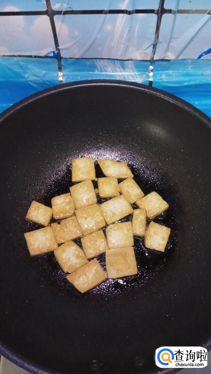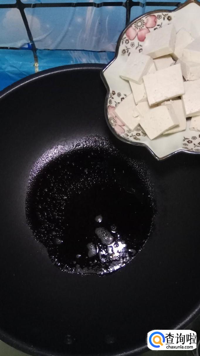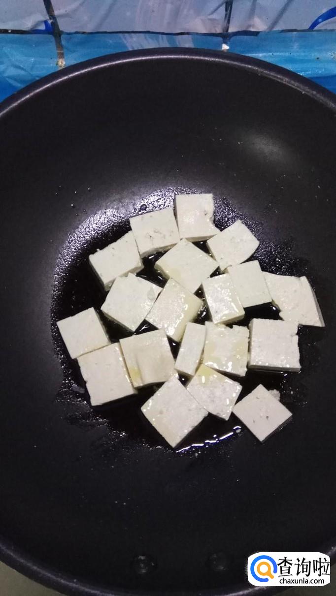 炒锅中放入适量油,油热后将老豆腐放入锅中,小火慢煎。
