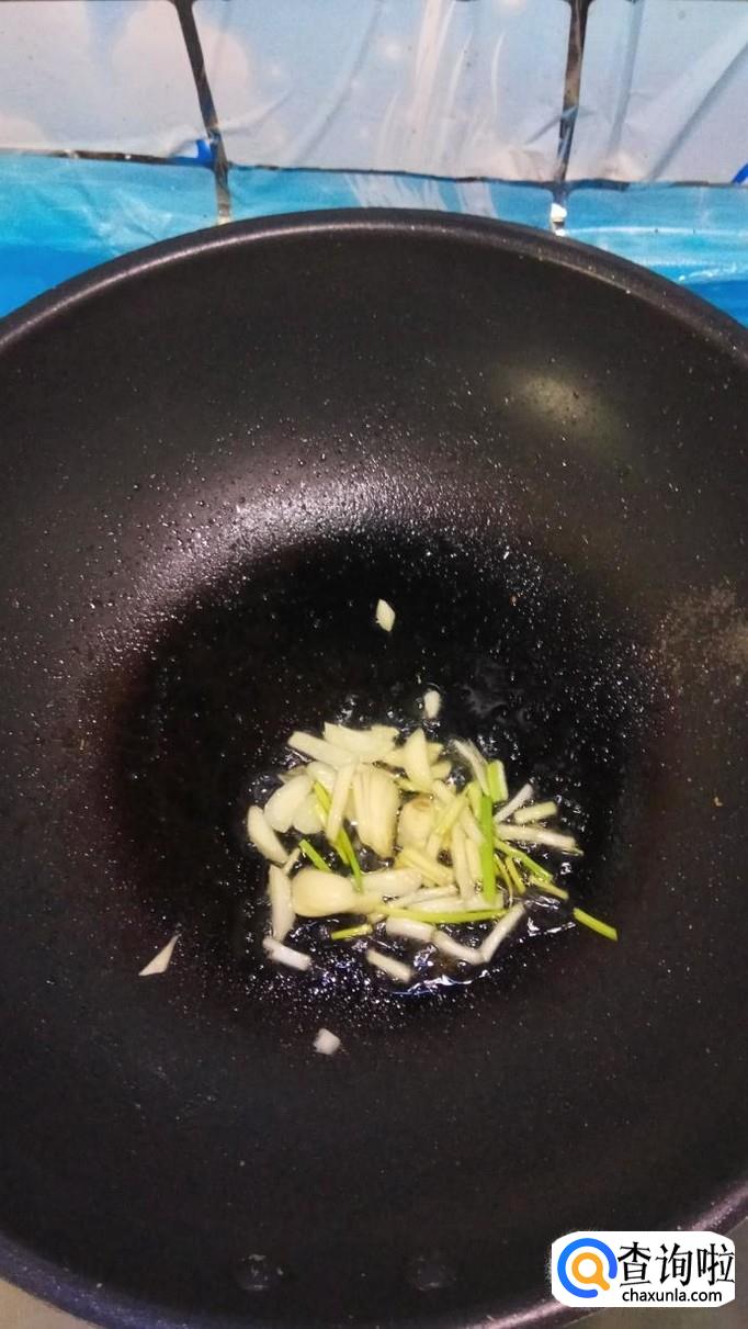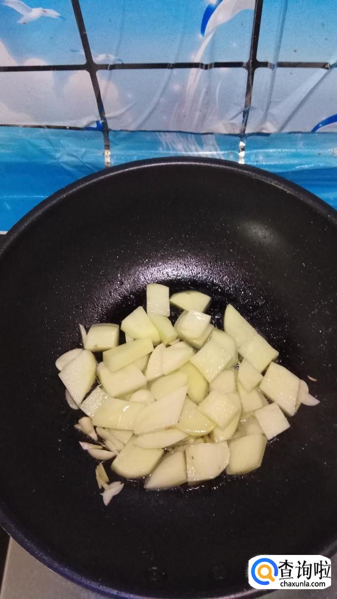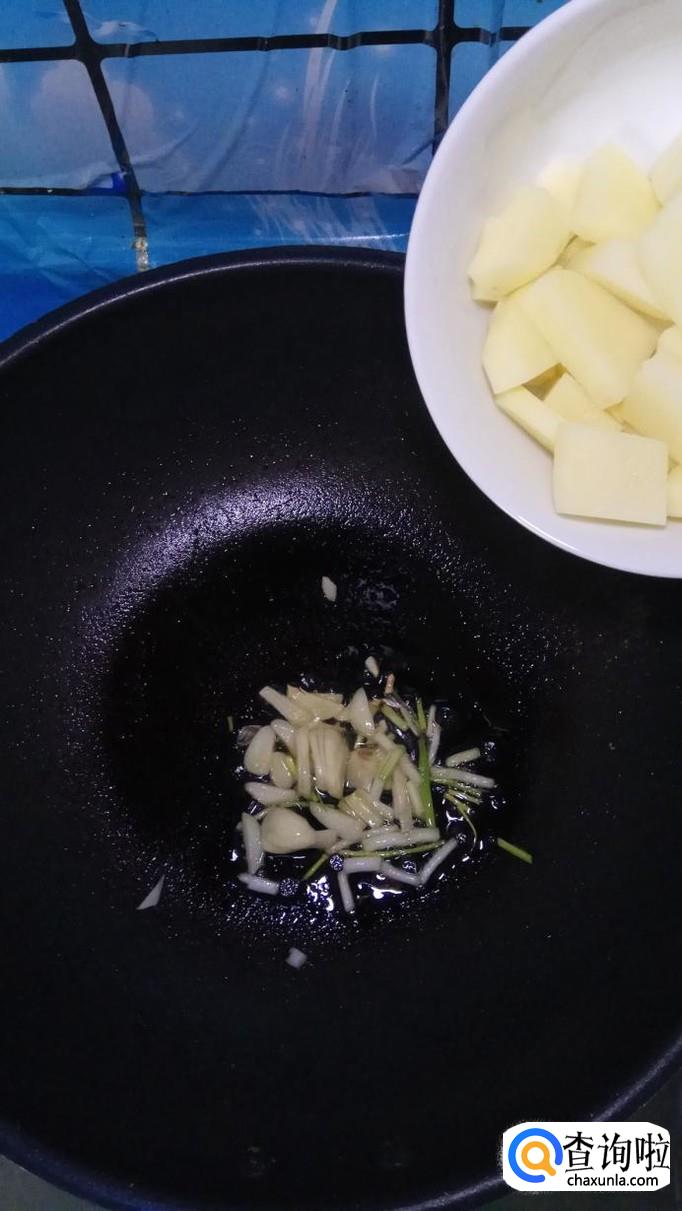 准备适量小葱和大蒜,洗净后将它们切碎。炒锅中放入适量油,油热后,将它们放入锅中炒香,然后将准备好的土豆放入锅中,翻炒均匀。