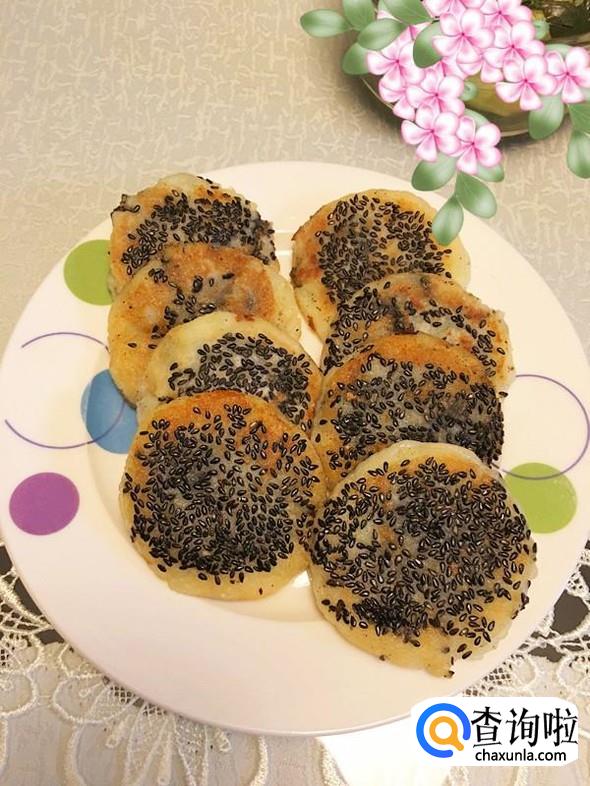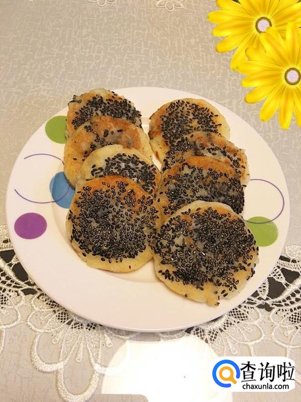 包好后封口朝下,压扁,并在上面撒上少许芝麻,用手掌轻轻按压。