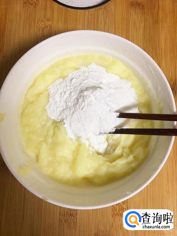 蒸熟的土豆片稍微晾凉,然后用勺子压成土豆泥。
