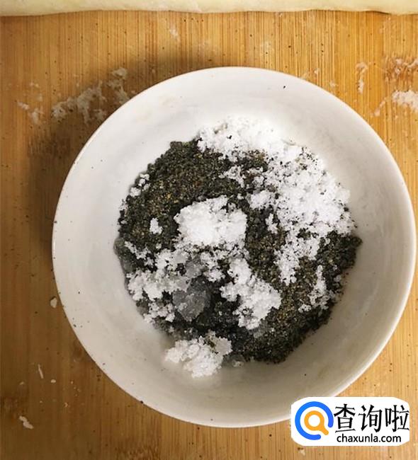芝麻粉中加入1小勺白糖,再加入少许食用油,搅匀后做成馅心。芝麻粉在一般大型超市都有卖,也可以自己在家把芝麻炒熟后,再用粉碎机打碎。