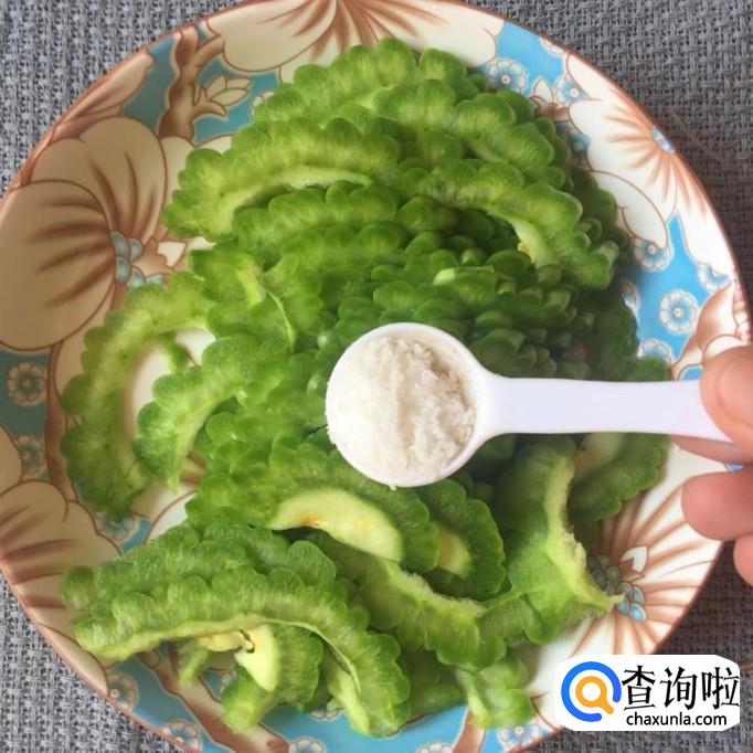 接着把苦瓜用适量的盐巴腌一下,如下图所示。
