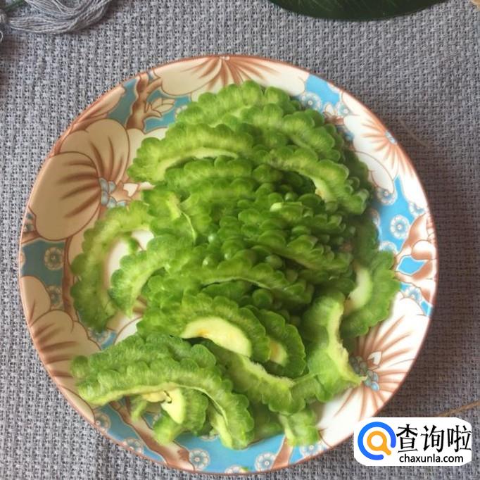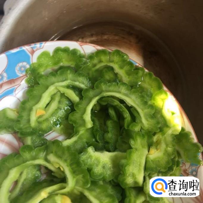 然后把苦瓜去籽去瓤,切成薄片,如下图所示。苦瓜去瓤是为了让煮出来的汤,不会太苦,大家可以尝试一下。
