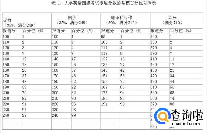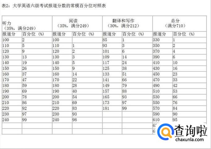 至于分数如何去解释呢,官网也给了我们两个分数对照表,按照考生的分数来进行对比分析。比如某考生六级报道总分是500分,从表中可以查到其在常模群体中的相应百分位在42%~53%之间,表示这名考生的英语成绩至少优于常模群体中42%的人,但不会优于53%的人。