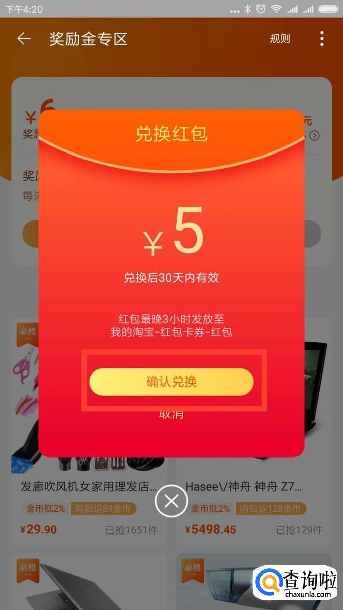 接下来就是将你的奖励红包兑换成现金红包,确认兑换,这时候就可以在购物时当做现金进行抵扣了。