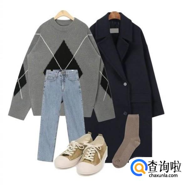 浅色牛仔直筒裤加上灰黑相间的毛衣,外套黑色长款外套,最后一双帆布鞋,简直不能再美