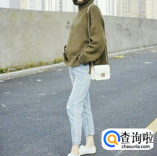 墨绿高领衫与浅色破洞牛仔裤组合,慵懒随性又不失时尚