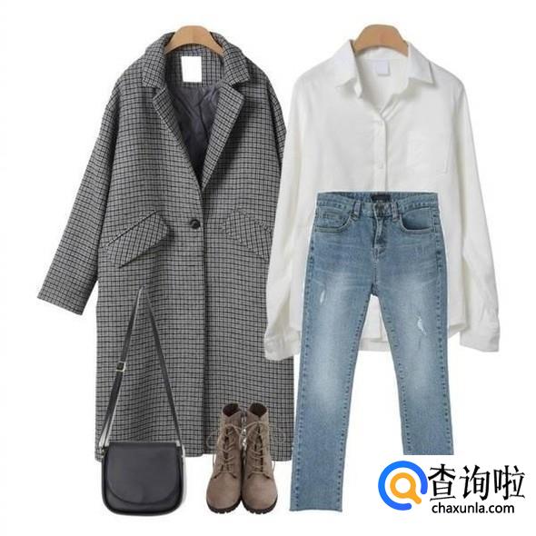 浅色牛仔上穿一个白衬衫,外面加条纹的长外套,然后肩上背一个黑色的小方包,很成熟的搭配。
