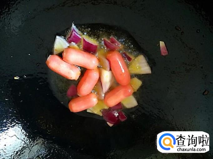 炒锅里加入适量的植物油烧到7成热,加入适量的小火腿肠炒1分钟,快速放入洋葱继续炒片刻。