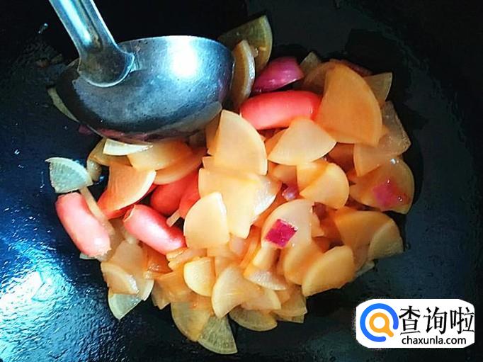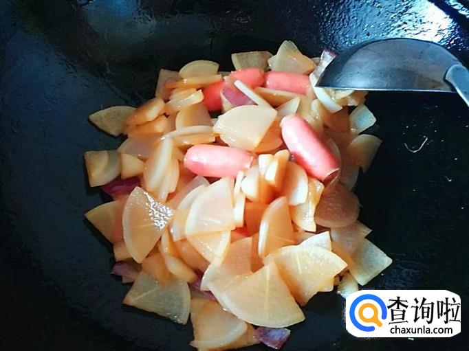 小火腿肠、洋葱、象牙萝卜、食盐、植物油、酱油、鸡精各适量
