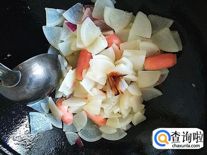 加入焯好的象牙萝卜一起炒2分钟左右,加适量的酱油再翻炒入味。