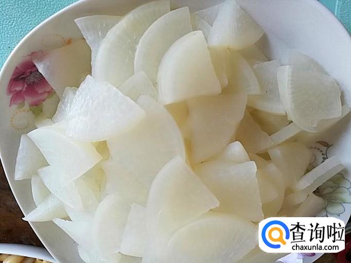 把象牙萝卜洗净切成如下的片,用开水焯一下备用。