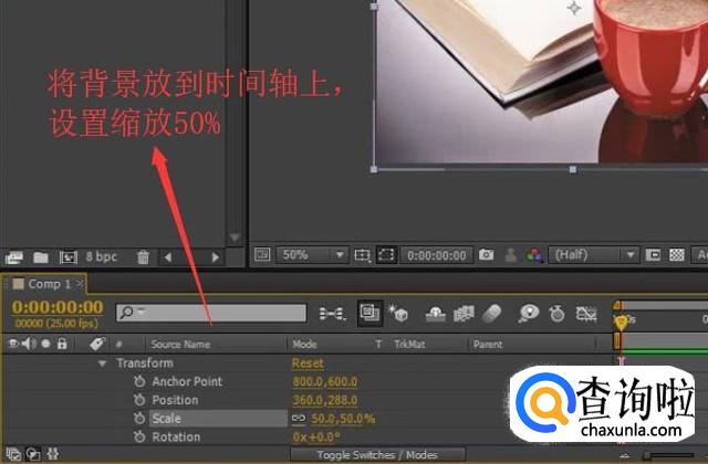 然后我们将背景拖放到时间轴上并设置背景缩放的比例为50%,如下图所示