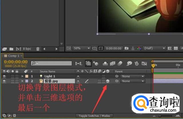 然后选中背景图层,点击底部的切换图层按钮,接着点击三维选项的最后一个,如下图所示