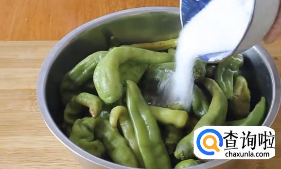 接着把处理好的辣椒放入大一点的容器中,放些许盐。