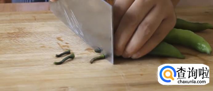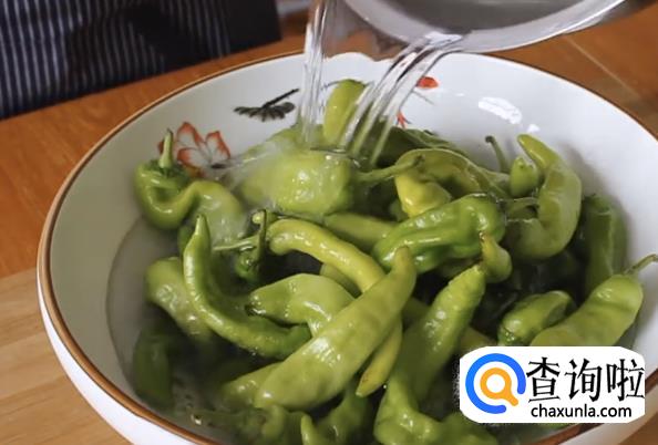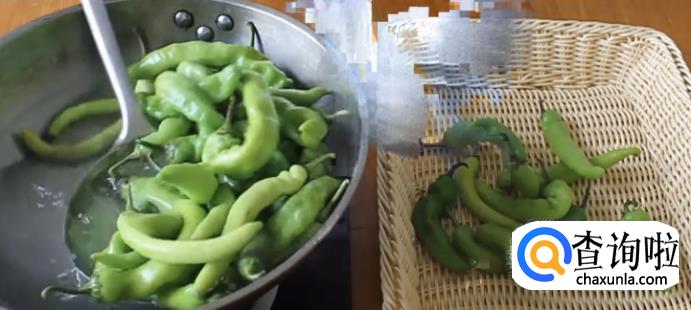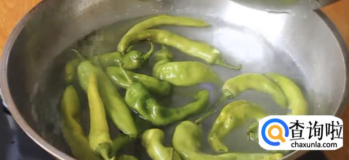 把洗好的辣椒放入锅中烫一下,这样能够很好的保留辣椒的清脆口感。