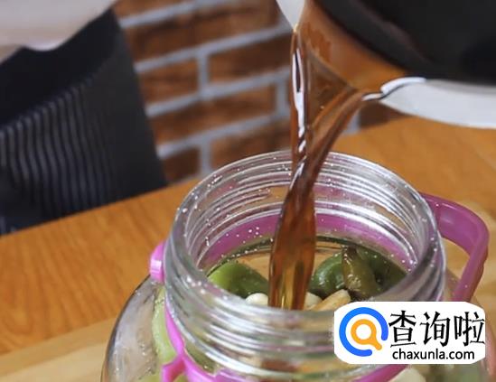 然后把抓匀的辣椒放入可以密封的容器里面(最好先对容器进行消毒),倒入之前做好的酱汁。