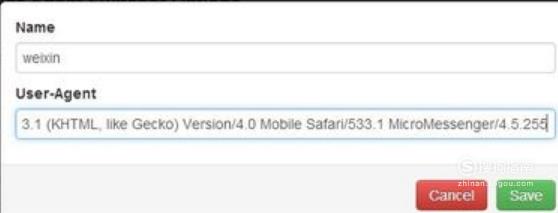 在出现的页面中的User-Agent下方框中输入“Mozilla/5.0 (Linux; U; Android 2.3.6; zh-cn; GT-S5660 Build/GINGERBREAD) AppleWebKit/533.1 (KHTML, like Gecko) Version/4.0 Mobile Safari/533.1 MicroMessenger/4.5.255”,在Name下输入weixin,点击Save。