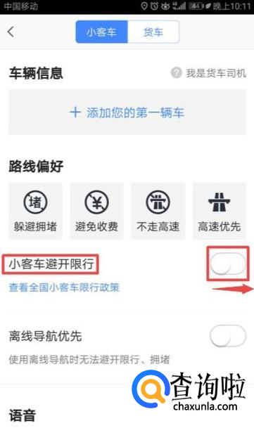 之后我们将小客车避开限行的开关向右滑动;