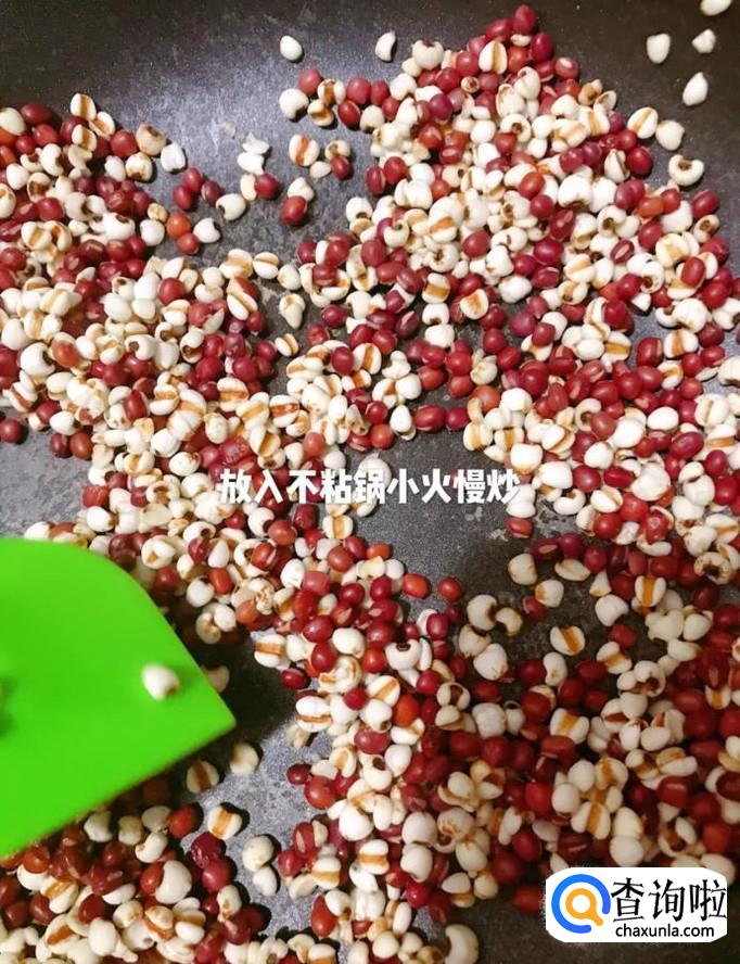 然后将清洗干净的薏米和红豆倒入不粘锅,开小火慢炒,如下图所示。