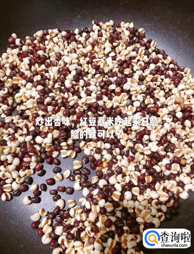 接着等到锅中的薏米和红豆炒出香味,拿出一些用牙齿咬一下,如果是脆的,那么说明我们的薏米和红豆就炒好了。