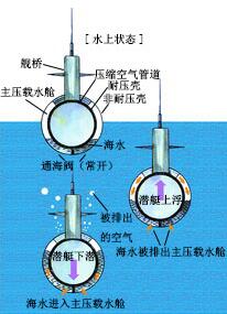 受此启发,人们给潜艇也安装了一个类似鳔的舱体,它就是潜艇两侧被称为主压载水舱的舱体。主压载水舱的功能就是通过注水、排水实现潜艇的下潜、上浮。要下潜时,往主压载水舱注水,空气被排出艇外,潜艇的自重增加,艇体下沉。要上浮时,用高压气体把主压载水舱的水压出艇外,潜艇的自重减少,潜艇便可浮出水面。