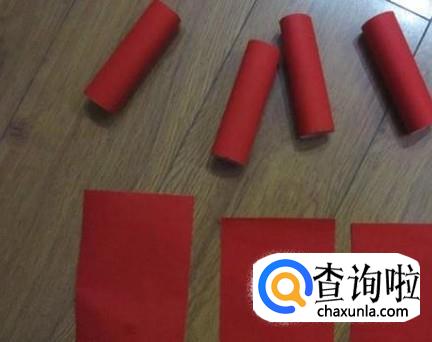 把每一块红纸卷成卷,用胶水把连接处粘牢,做多少个鞭炮,就卷多少张红纸。