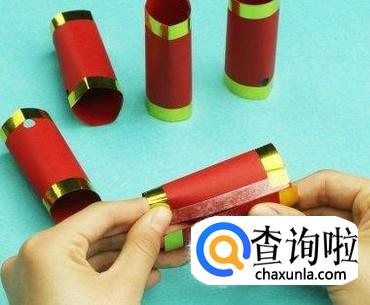 还可以把金纸裁成相同的小条,粘在鞭炮的上下两端,看起来更漂亮。