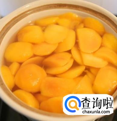 将切好的黄桃放入锅中,加入清水使其没过黄桃,如图所示。