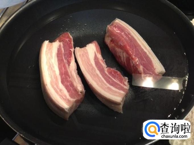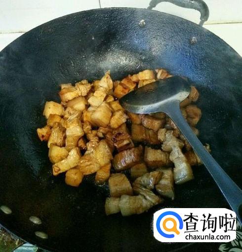 然后我们要把白糖放入锅中炒,等白糖变红色,就把煮好的五花肉放入锅中上色。
