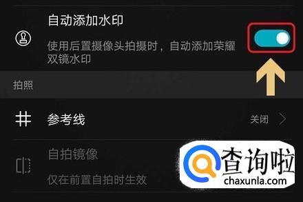 将此页面中的“自动添加水印”打开,返回到相机,每次拍完照以后都会在相片的左下角看到手机型号的水印,见下图二;