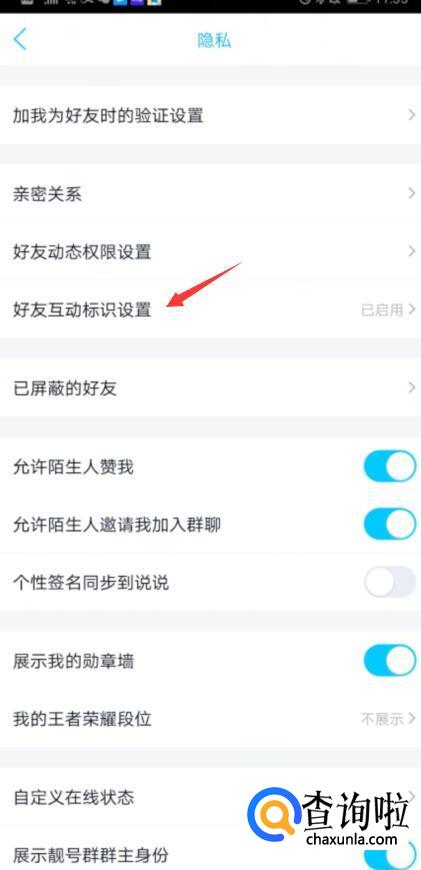 再依次点击:隐私——好友互动标识设置,再弹出的页面中往下拉,就可以看到qq大会员学院帽标识了,如图3。