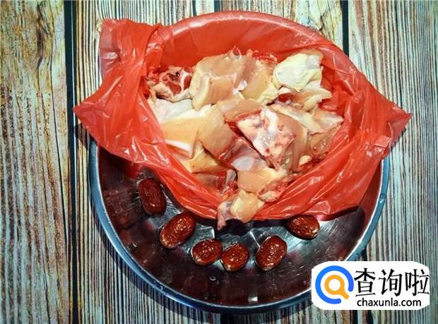 准备好所有材料:老母鸡半只,红枣六颗。