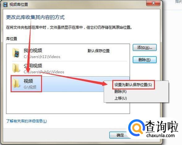 如图,在“视频库位置”对话框中已经新建了一个保存路径,位置是G盘,右键单击,在快捷菜单中选中“设置为默认保存位置”,然后点击确定。