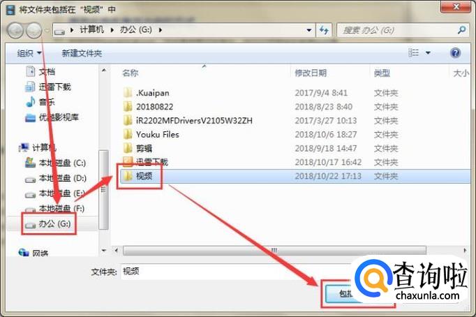 在弹出对话框中选择非C盘,譬如G盘,新建“视频”文件夹,选中后点击下方的“包括文件夹”。
