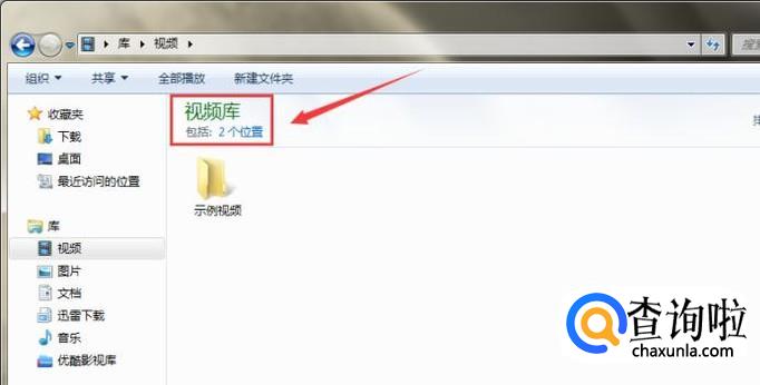 点击打开要更换保存路径的文件夹,这里打开的是“视频”,如图,我们可以看到“包括2个位置”,点击该字样。